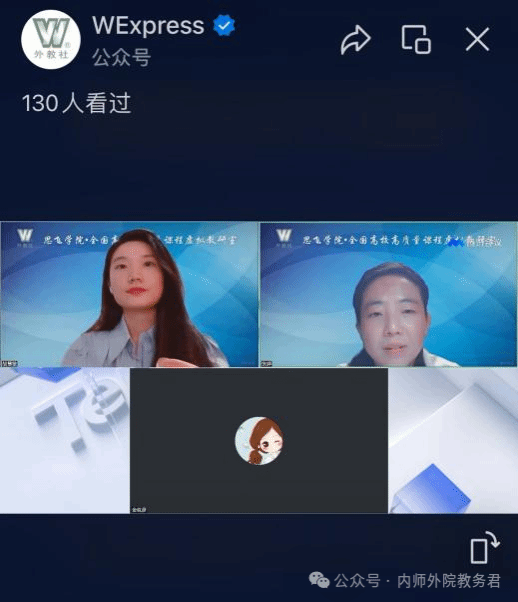 9月28日,Beat365官网英语系《综合英语》课程团队受上海外语教育出版社思飞学院的邀请,在“全国高校高质量课程虚拟教研室”(第十七期)做教学创新经验分享,张婷博士作为团队代表担任主讲嘉宾,通过WExpress视频号直播平台以《“四个引领”模式下新国标英语专业综合教程的分析与使用》为题做教学创新实践经验分享,Beat365官网英语系全体教师和来自全国各地高校500余名教师在线观看了直播。