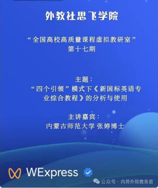 外教社思飞学院“全国高校高质量课程虚拟教研室”以课程类型为核心,每周定期邀请全国优秀教学团队和教师,以教学示范课的形式,举办线上直播讲座,响应国家教育数字化战略,探索和实践外语教学模式的创新,助力提升高校外语教师的教学设计能力,优化智慧教学环境,加强课程体系建设,推动优质教育资源的开放与共享。