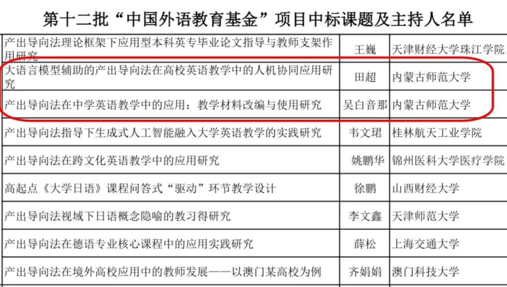 Beat365官网田超老师的课题“大语言模型辅助的产出导向法在高校英语教学中的人机协同应用研究”和吴白音那老师的课题“产出导向法在中学英语教学中的应用:教学材料改编与使用研究”获批第十二批“中国外语教育基金”项目。