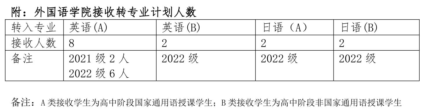 (1)因专业特殊性,日语专业只接受2021级学生转入2022级就读申请。高中阶段修读日语课程,有日语基础的优先,学生需参加日语水平考试,按照考试成绩排名先后录取;