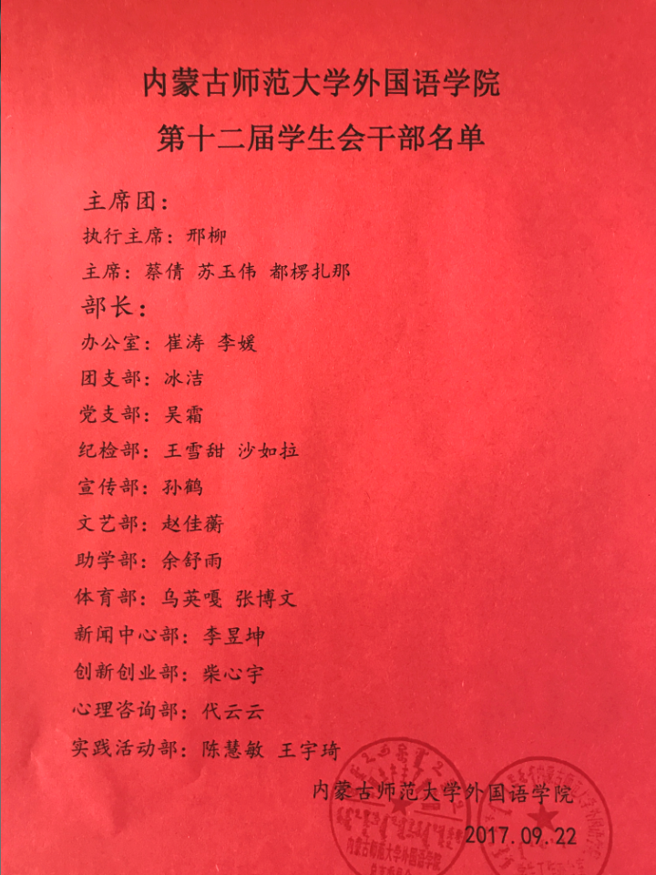 Beat365中文官方网站第十二届学生会主席团及各部长名单公示