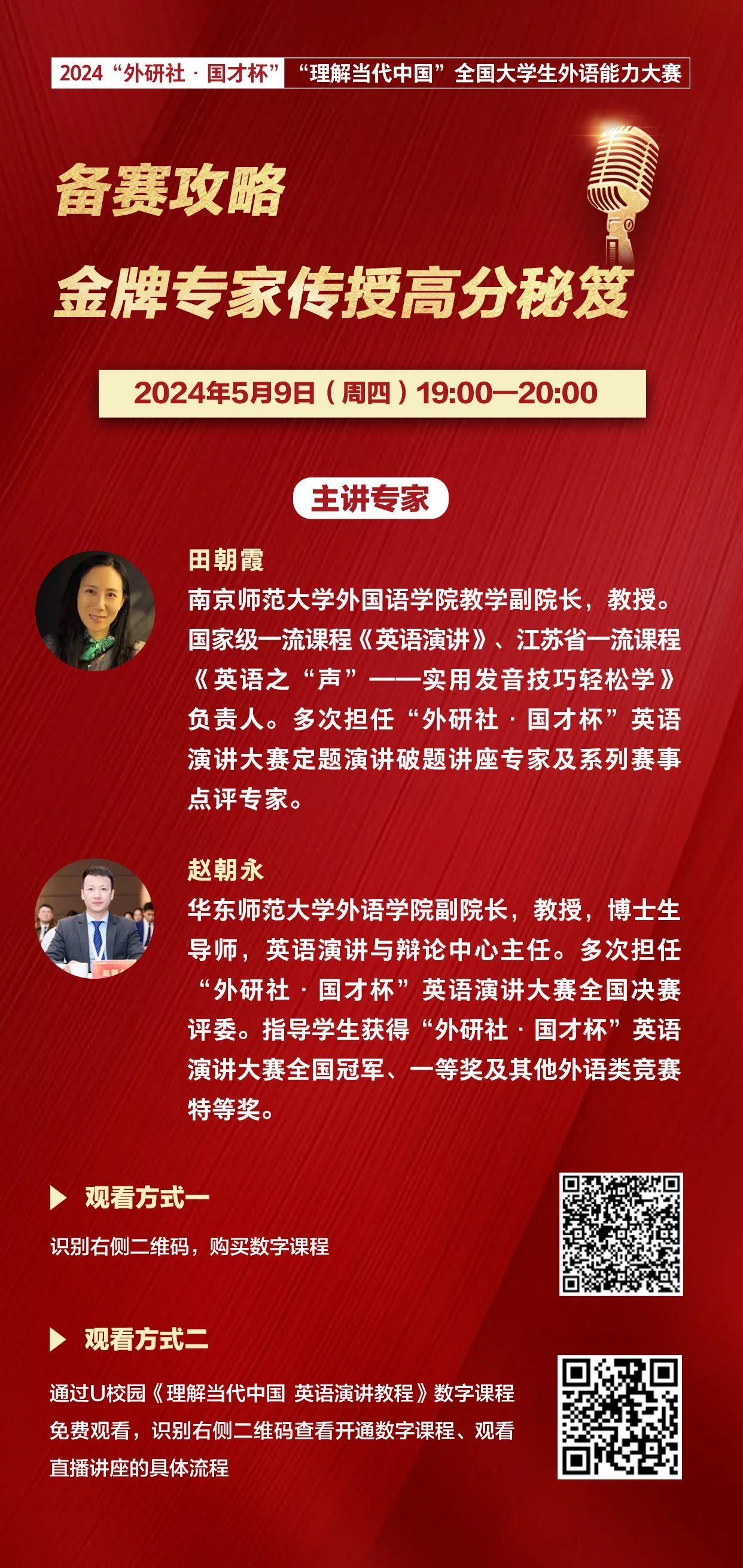 定题演讲破题讲座第二期将于5月9日晚7点举行,届时演讲教学专家、大赛评委南京师范大学田朝霞教授和华东师范大学赵朝永教授将继续解读定题演讲题目,传授演讲高分秘笈,助力选手高效备赛。