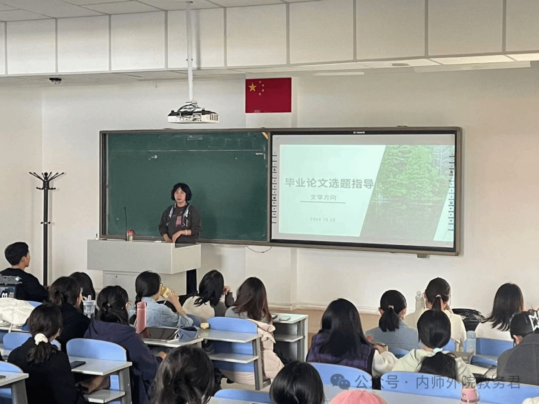 10月22日下午,刘海霞老师围绕文学研究方向展开指导,鼓励学生从美国、英国和澳大利亚文学中选择题材,涵盖小说、诗歌、散文和戏剧等。在研究文学作品时,鼓励学生从不同的角度来探讨主题和人物形象。而在研究创作手法上,可以关注象征、讽刺以及意识流等技巧。这些手法能够丰富作品的表达方式,增强文学作品的艺术魅力和深度。最后,刘海霞老师强调选题应带有明确的问题意识,运用西方文学批评理论进行深入分析。