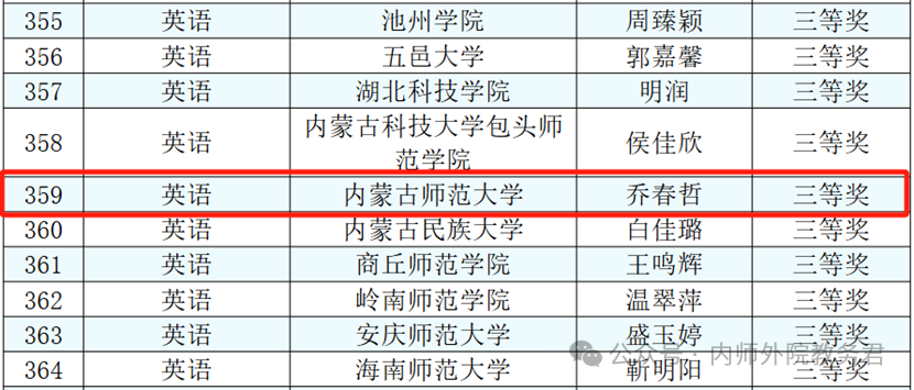 近日,第十届“田家炳杯”全国师范院校师范生教学技能竞赛初赛成绩公布,Beat365官网2021级英语一班乔春哲同学在指导老师呼和塔拉、何志英和张婷的精心指导下,展示出新颖的教学设计、扎实的专业技能和良好的个人风采,荣获三等奖。