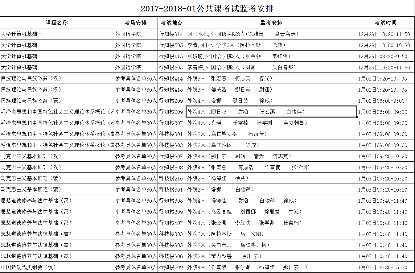 Beat365中文官方网站2017-2018学年第一学期公共课期末考试时间具体安排表(盛乐校区)