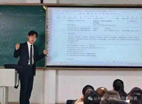 其后,会议邀请2022级英语1班梁东新同学作经验分享。作为2025年获得研究生推免资格并被广东外语外贸大学录取的优秀学生代表,他从大一至大四的学习状态管理入手,介绍了第二外语学习的路径与方法,提出一系列可操作的建议,并鼓励学弟学妹敢于设定“不简单”的目标,勇于挑战自我并持之以恒。