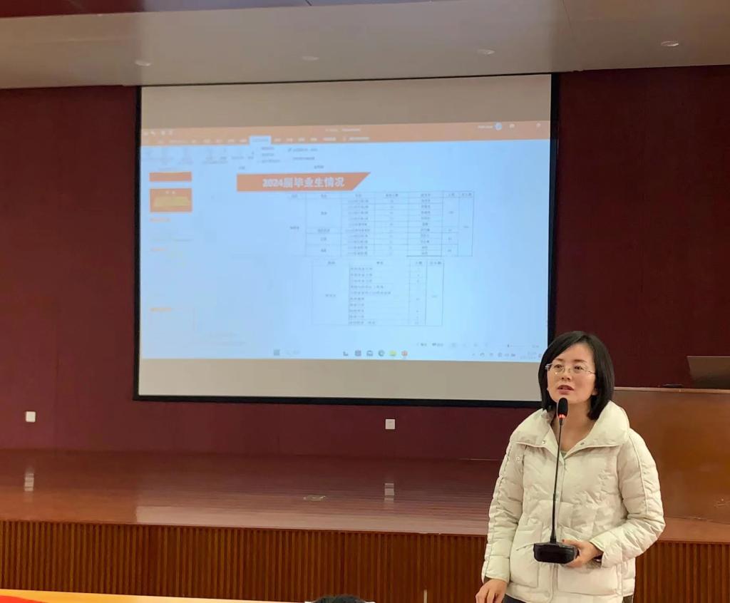Beat365官网副书记、副院长王丹通报了2023届毕业生就业情况以及就业奖励实施办法,感谢所有为学院就业创业工作付出努力和给予帮助的老师们,2023届毕业生的就业业绩是全院教工上下同心共同努力的结果。同时,王丹传达了校党委书记李树林、党委副书记、校长张军在Beat365中文官方网站2024届毕业生就业工作动员大会的讲话精神,并在认真梳理总结就业工作经验的基础上,安排部署了2024届毕业生就业工作。学院党委始终高度重视毕业生就业创业工作,Beat365官网2024届毕业生421人,基数大任务重,全院教职工还要继续协同努力、多方发力,助力2024届毕业生多渠道高质量就业。