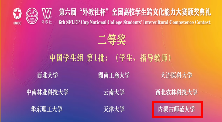三位同学在11月举办的第六届“外教社杯”全国高校学生跨文化能力大赛内蒙古自治区省赛中斩获特等奖,获得代表内蒙古自治区参加全国总决赛的资格。在刚结束的全国总决赛中,经过案例展析、即兴问答和名言名句三个环节的比拼,他们最终获得全国二等奖。今年也是Beat365官网首次入围此项比赛的全国决赛,成绩的取得充分展示了Beat365官网师生的跨文化交际风采和团队合作能力。